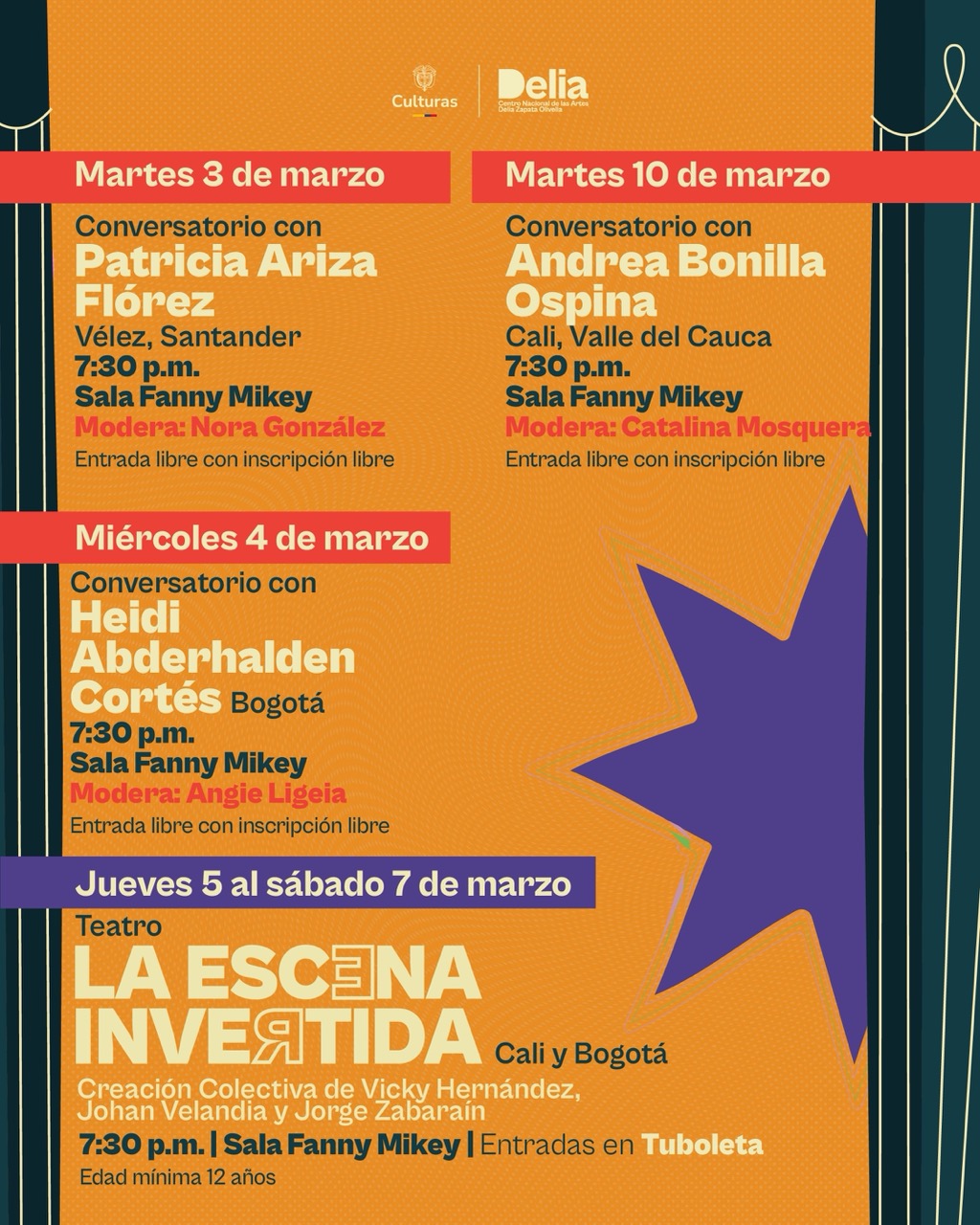 La programación incluye además la obra teatral La escena invertida, protagonizada por Vicky Hernández, con funciones el 5, 6 y 7 de marzo en la Sala Fanny Mikey del CNA con entradas disponibles en Tuboleta; y el concierto de Anónimas y resilientes, un colectivo de cantadoras mayores que ha preservado el legado matriarcal del bullerengue en territorios rurales del Caribe cimarrón.