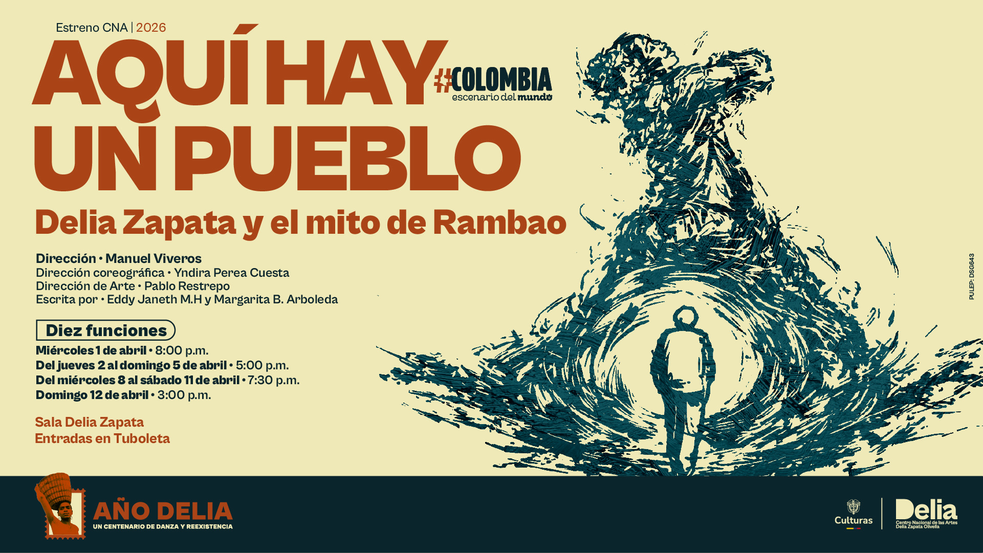 El 1 de abril, el Centro Nacional de las Artes del Ministerio de las Culturas, las Artes y los Saberes, presenta Aquí hay un pueblo: Delia Zapata y el mito de Rambao, una de las obras centrales del centenario de Delia Zapata Olivella y parte de la programación del Festival Internacional de Artes Vivas.
