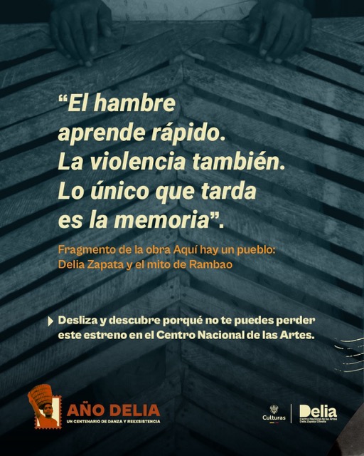 - El 1 de abril, el Centro Nacional de las Artes presenta Aquí hay un pueblo:Delia Zapata y el mito de Rambao, una de las obras centrales del centenariode Delia Zapata Olivella y parte de la programación del Festival Internacionalde Artes Vivas. Serán 10 funciones, dos de ellas serán accesibles: con audiodescripción y lenguaje de señas colombiana.
