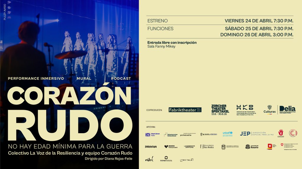 A partir de laboratorios de creación realizados en Colombia con sobrevivientes y comunidades vinculadas a organizaciones de derechos humanos, surge el colectivo La Voz de la Resiliencia y la performance multimedia Corazón Rudo. La obra integra video, música en vivo, texto e instalación sonora con testimonios de personas reclutadas en su infancia.