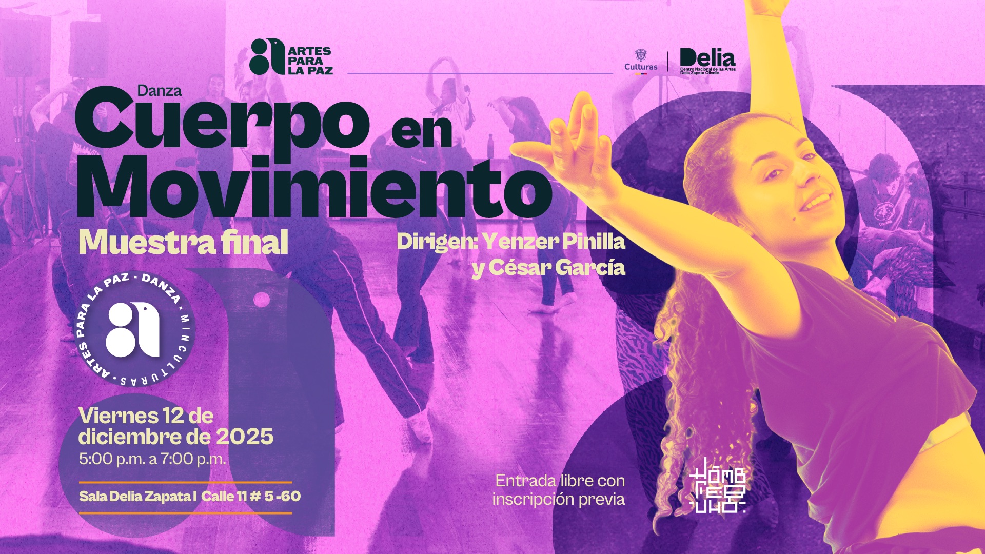 Cuerpo en Movimiento llega a su etapa final. Este viernes 12 de diciembre, en la sala Delia Zapata, se llevará a cabo la muestra final de este proceso formativo en danza contemporánea, desarrollado en el marco del programa Artes para la Paz del Ministerio de las Culturas, las Artes y los Saberes, con el apoyo del Centro Nacional de las Artes.
