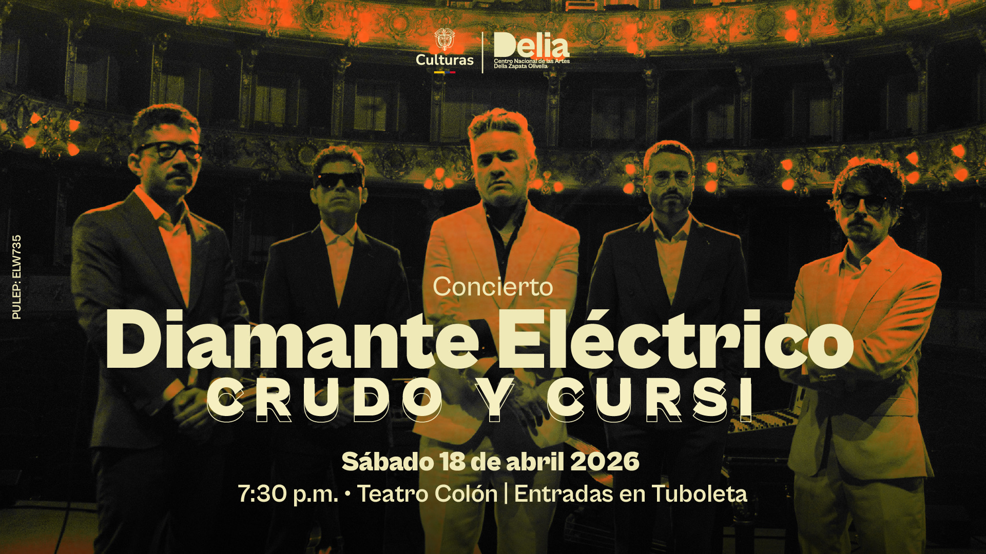 Diamante Eléctrico, una de las bandas más importantes del rock colombiano contemporáneo, llega al Teatro Colón del Centro Nacional de las Artes con Crudo y cursi, un concierto íntimo y poderoso que reimagina su repertorio desde la cercanía, la emoción y la intensidad del directo. El sábado 18 de abril de 2026, a las 7:30 p.m., el proyecto liderado por Juan Galeano y Daniel Álvarez Mejía presentará un formato electro-acústico especialmente diseñado para el teatro: cuatro músicos en escena, una propuesta lumínica envolvente y una puesta en espacio que privilegia la escucha, el detalle y la conexión con el público.