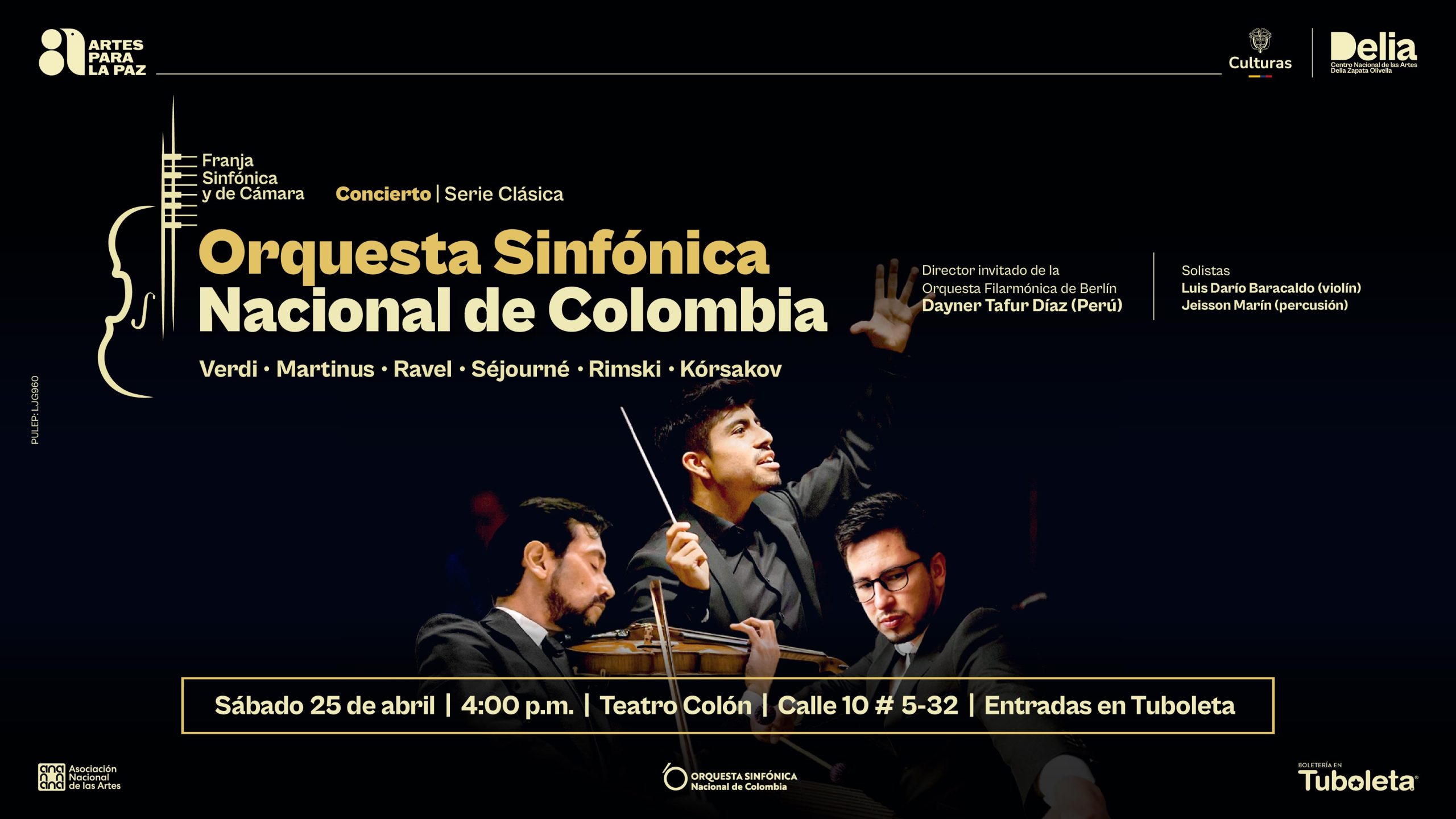 El concierto estará dirigido por el maestro peruano Dayner Tafur-Díaz como director invitado, actualmente director asistente de la Filarmónica de Berlín y becario de la Karajan-Akademie, tras haber obtenido la Siemens Conductors Scholarship, uno de los reconocimientos más relevantes para jóvenes directores a nivel internacional . Participan como solistas el violinista colombiano Luis Darío Barracaldo y el percusionista Jeisson Marín, intérpretes con trayectoria en repertorio sinfónico y contemporáneo.