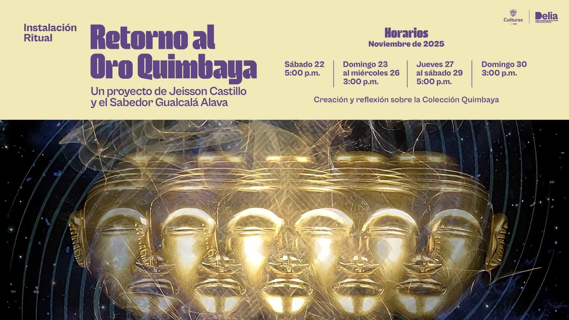 Retorno al Oro Quimbaya es una instalación ceremonial inmersiva que invita al público a reencontrarse con las tecnologías ancestrales de consulta, limpieza y confesión, para abrir un camino simbólico de retorno espiritual hacia las 122 piezas de la Colección Quimbaya que hoy se encuentran fuera del país. Concebida para la Sala Fanny Mikey, la experiencia propone un espacio en constante transformación, articulado en anillos sensoriales que rodean una escultura ritual y que se activan a través de la danza, el sonido y la participación del público. Esta obra despliega un universo donde memoria, cuerpo y territorio se entrelazan para reimaginar los acuerdos de cuidado que guiaron a los pueblos originarios en su relación sagrada con el oro.