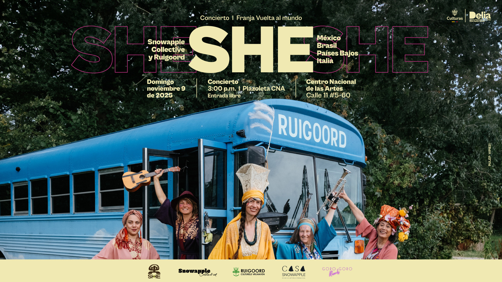 ‘She’ es un proyecto internacional impulsado por Snowapple Collective y Ruigoord, creado en 2023 con el propósito de unir el arte con el activismo y la conciencia ambiental. Este proyecto conecta la lucha de activistas con la alegría y energía de la música y la danza. De manera festiva e inspiradora, interpretan canciones, bailes y narraciones que abordan la realidad actual y futuros posibles.