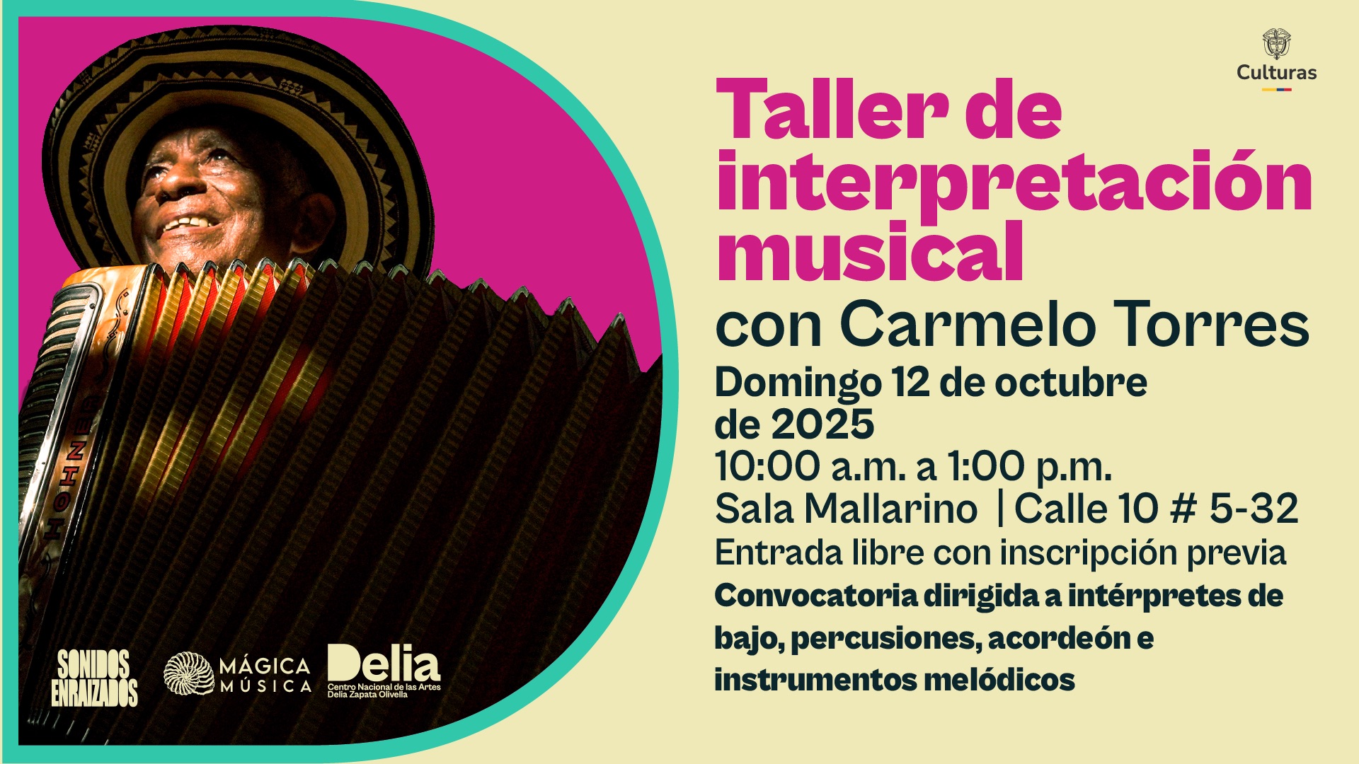 Nota: Las y los participantes deben tener experiencia previa en la interpretación del acordeón, percusión o bajo. Así mismo, los participantes deben traer su propio instrumento.
