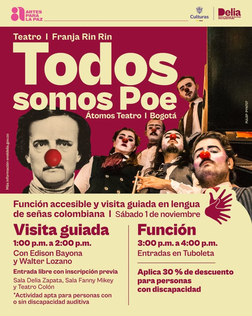 Un club de lectura conformado por cuatro payasos que interpretan y reimaginan los cuentos de Edgar Allan Poe protagoniza la próxima obra familiar que se presentará en la Franja Rin Rin del Centro Nacional de las Artes. ‘Todos somos Poe’, de la compañía bogotana Átomos Teatro, combina humor, farsa, suspenso y teatro musical. Con juego escénico y música en vivo de violín y piano, se rinde homenaje a uno de los autores más influyentes de la literatura universal.