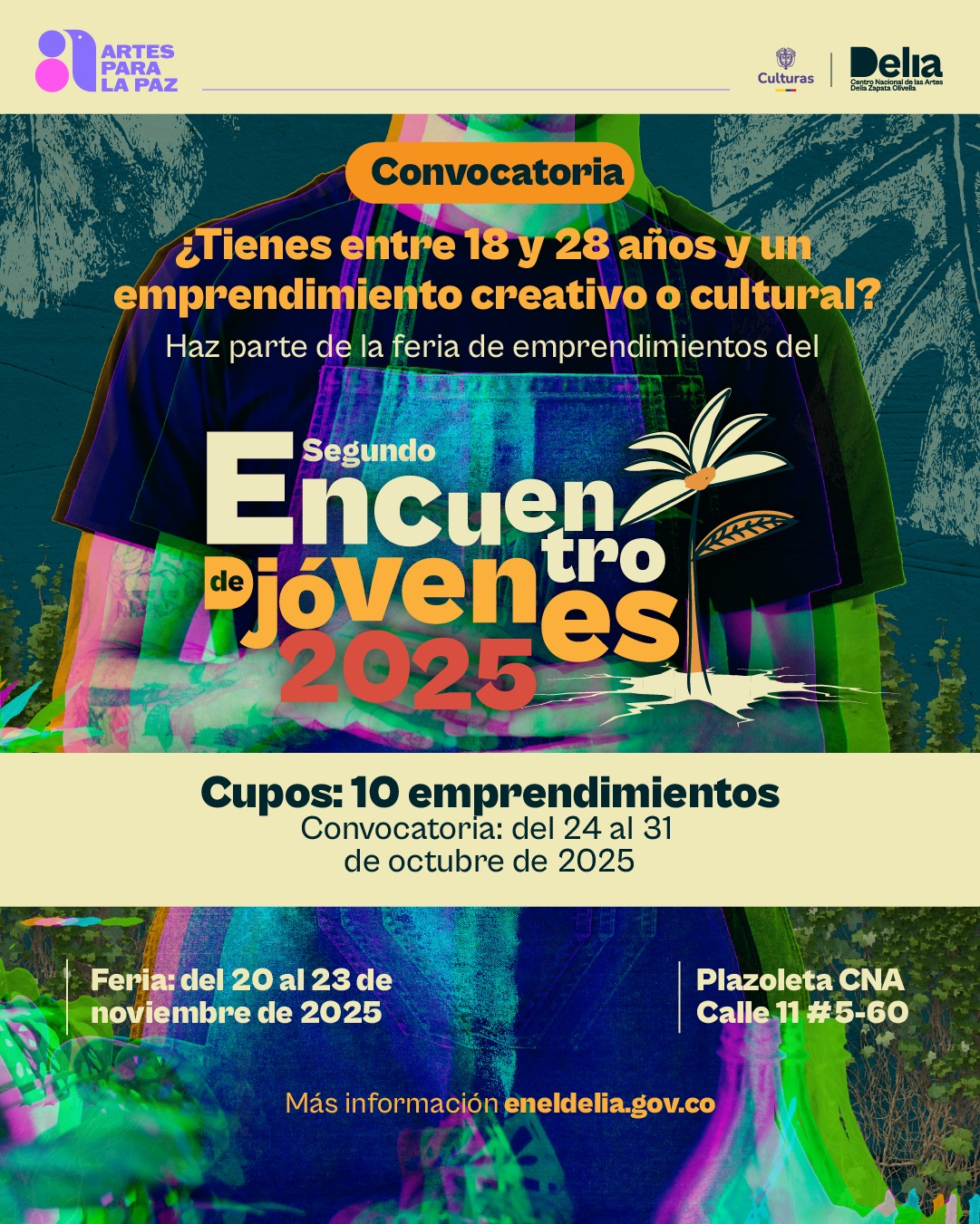 El Centro Nacional de las Artes Delia Zapata Olivella (CNA) invita a emprendedores y emprendedoras de 18 a 28 años a postularse a la Feria de Emprendimientos del Segundo Encuentro de Jóvenes 2025. Este Encuentro, que se realizará del 19 al 23 de noviembre de 2025 en Bogotá, es un espacio anual de creación, formación, circulación y mediación que pone a las juventudes en el centro de la programación del CNA, en línea con el Plan Nacional de Cultura 2024–2038 y las Mesas Consultivas con Comunidades de Práctica (“Párchese en el Delia”).